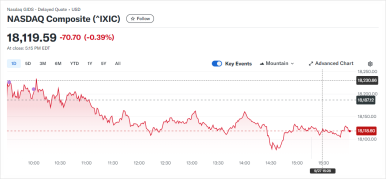 - 나스닥종합지수: 70.70포인트(0.39%) 하락하여 18,119.59에 마감.