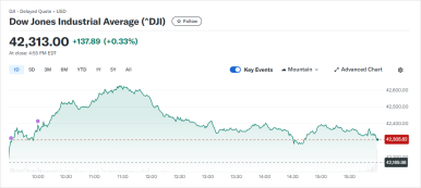 - 다우존스30산업평균지수: 137.89포인트(0.33%) 상승하여 42,313.00에 마감.